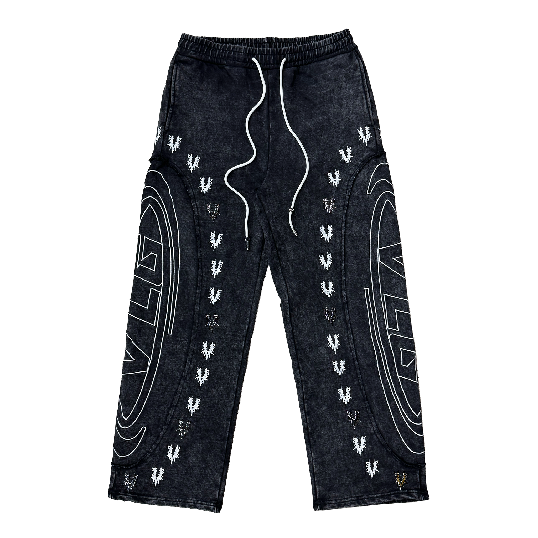 - These Village Chrome sweatpants feature a dark washed finish with bold embroidered and printed detailing running down both legs for a standout streetwear look. Repeating Village logos add texture and depth, while oversized side graphics bring strong visual balance from front to back. An elastic waistband with adjustable drawstrings ensures a comfortable, relaxed fit built for everyday wear. Designed to pair perfectly with the matching Village zip-up hoodie or worn as a statement on their own. Available now at Future Rfrnce.