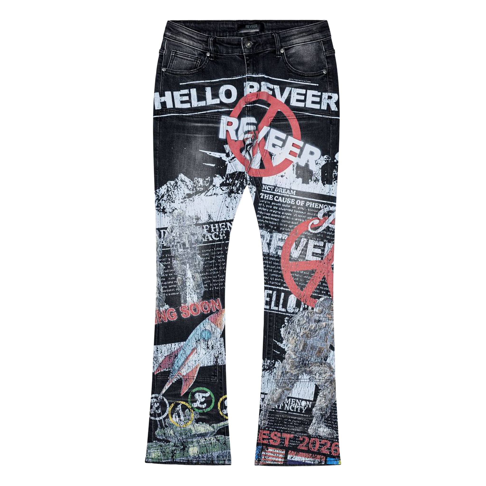- The War Zone Black Wash Stacked Denim delivers a bold, street ready look with its dark black wash, heavy stacking, and high impact graphic overlays. The distressed black base is layered with newspaper style prints, red warning motifs, and “Hello Reveer” typography for a rebellious, editorial aesthetic. Premium stretch denim and a slim stacked silhouette create a clean fit that drapes perfectly over your footwear. Detailed contrast stitching and branded accents elevate the overall construction while keeping the edge raw and modern. Shop the War Zone Black Wash Stacked Denim now. available at Future Rfrnce.