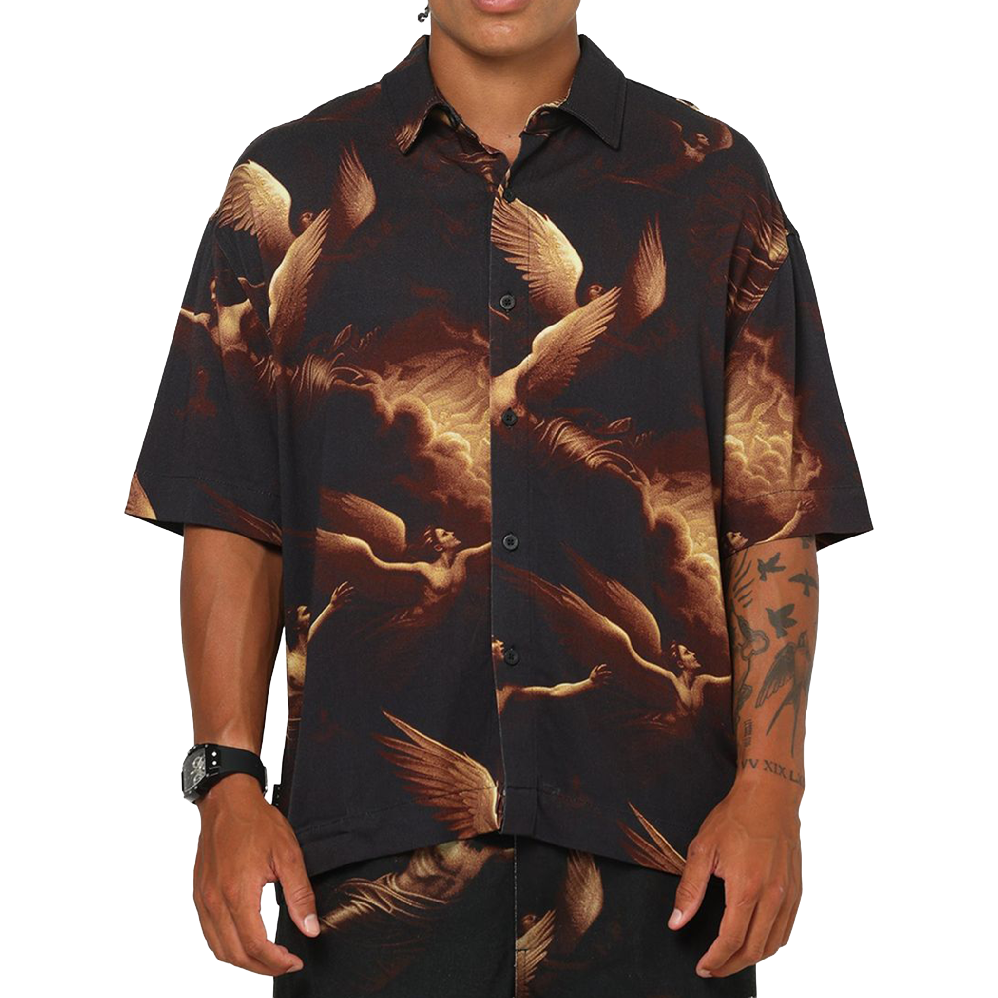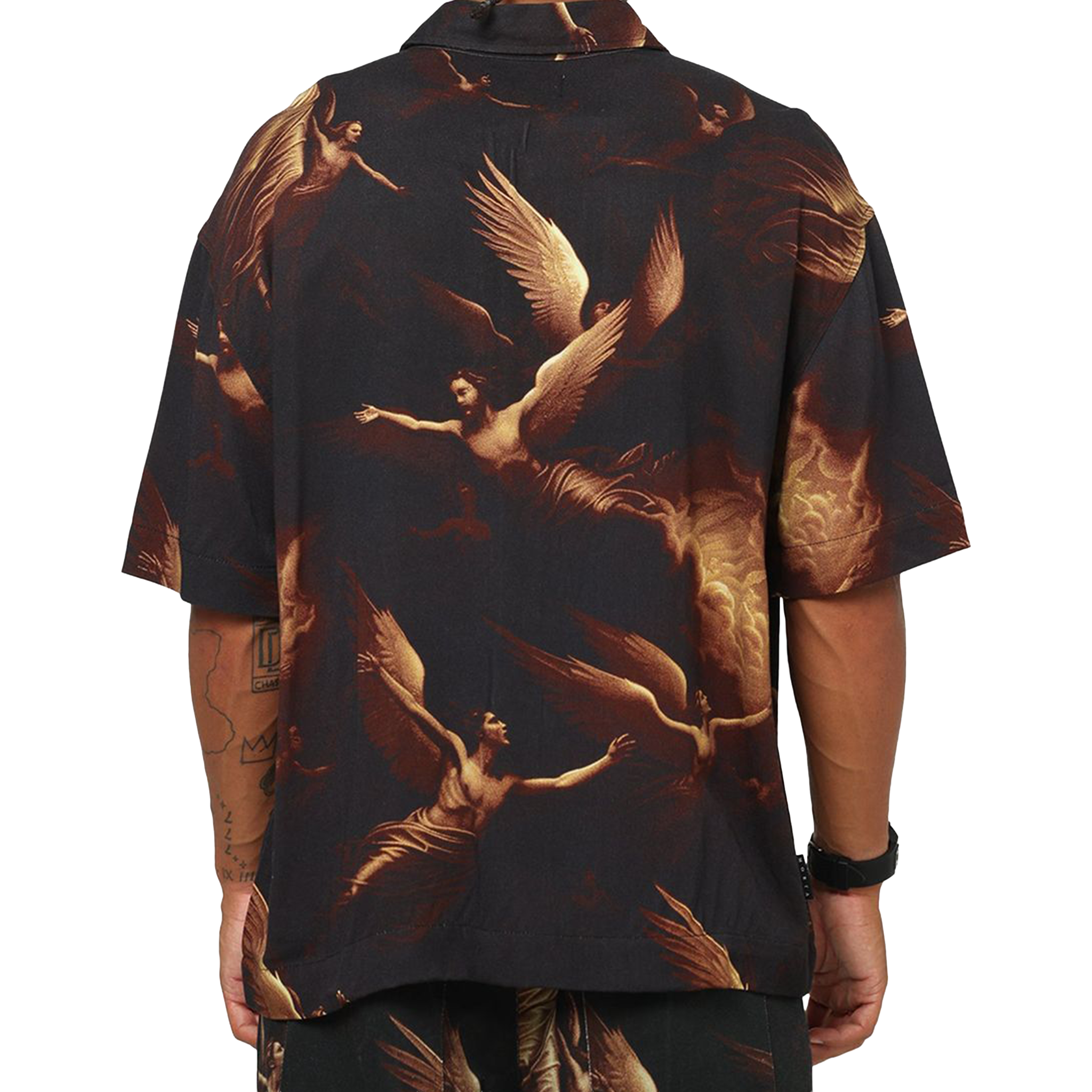 - The Saint Morta Rapture Button Up features a bold all-over print of angelic figures in a dark, vintage-inspired palette, creating a striking statement piece. Designed with a relaxed short-sleeve fit and lightweight feel, this shirt blends art and streetwear effortlessly. Finished with a classic button-up front and collar, it’s perfect for standout styling. You can purchase this item at our store, Future Rfrnce.