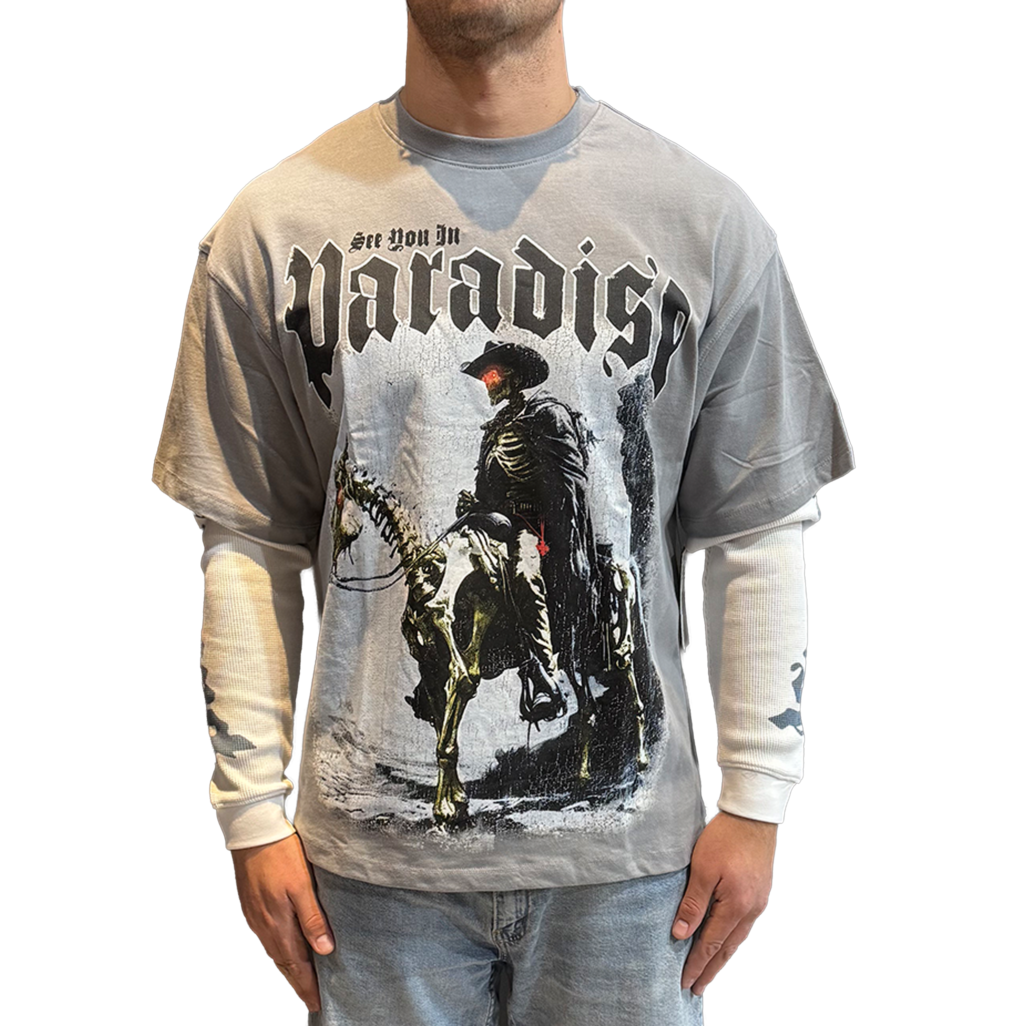 - This See You In Paradise graphic tee delivers a dark western-inspired look with a striking skeletal rider artwork printed across the front. The washed grey base gives the shirt a vintage, worn-in feel that enhances the dramatic gothic typography and detailed imagery. A bold cross symbol printed on the back adds a clean but powerful finishing touch, making the design stand out from every angle. Designed with a relaxed fit, this tee balances comfort with bold visual storytelling for everyday wear. Available now at Future Rfrnce.