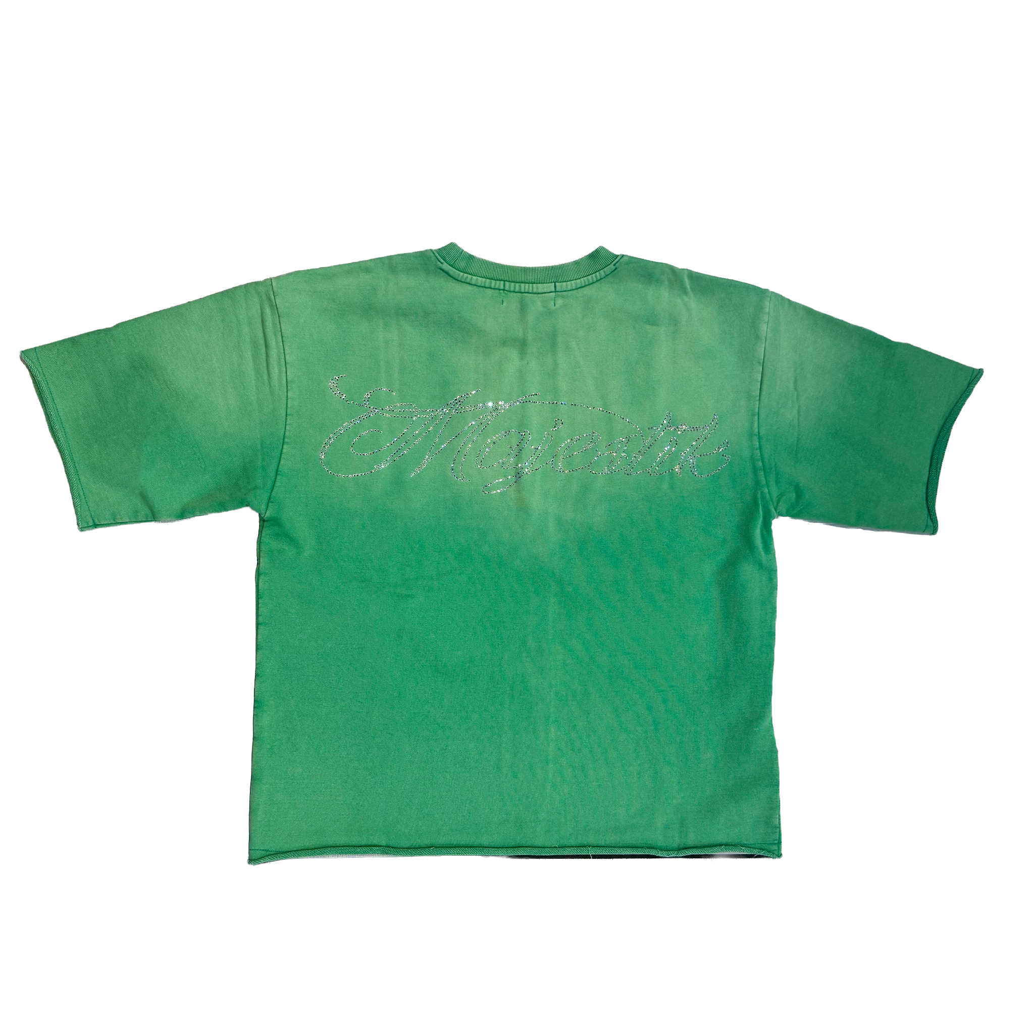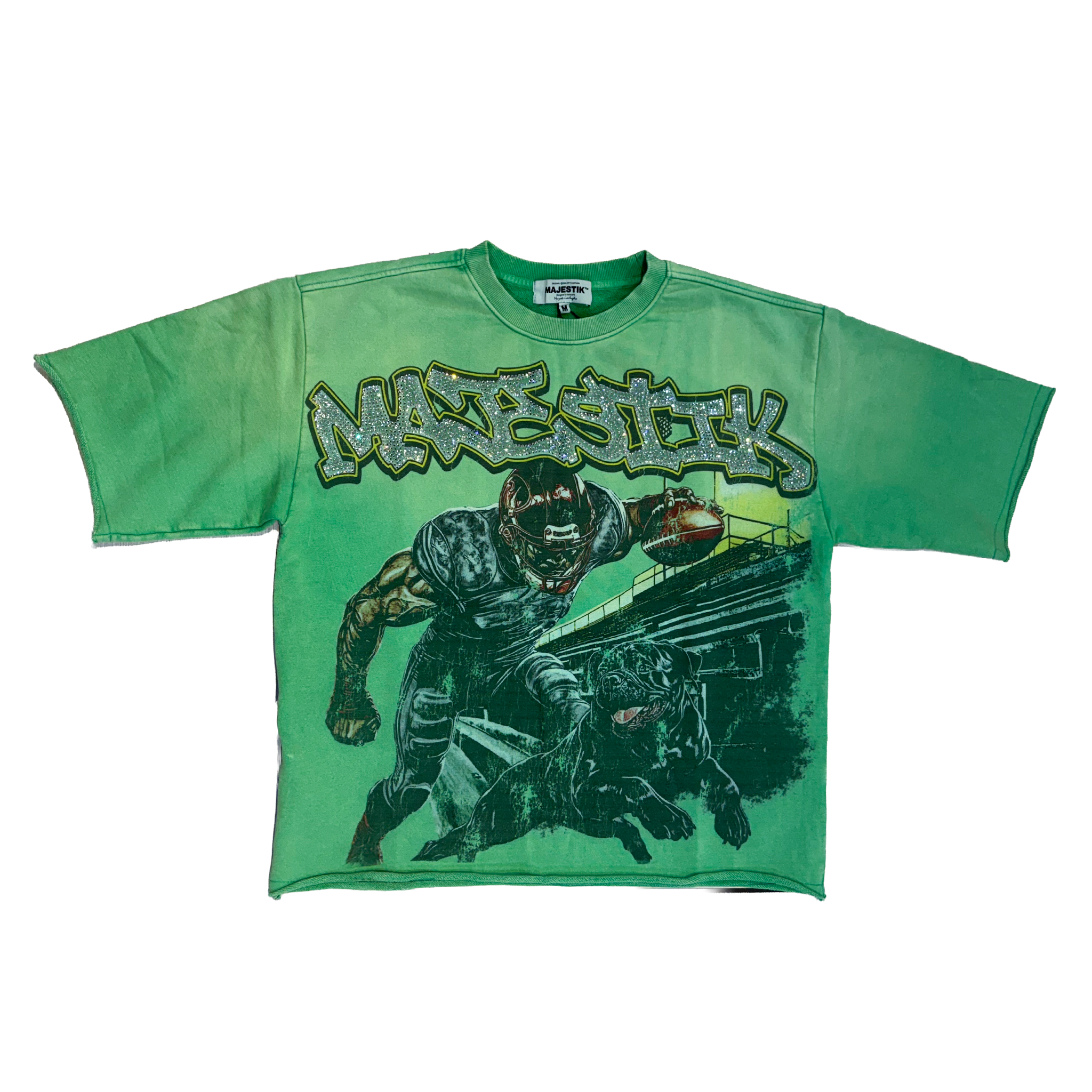 - This Majestik Football Stadium Tee delivers a bold, high-energy graphic featuring a fierce football player and panther charging across the field. The green wash adds a vintage athletic feel, while the rhinestone Majestik logo brings signature shine and streetwear edge. Its oversized fit makes it easy to style with jeans, cargos, or shorts for a standout game-day look. Perfect for anyone who likes their graphics loud and their tees statement-ready. Available now at Future Rfrnce.