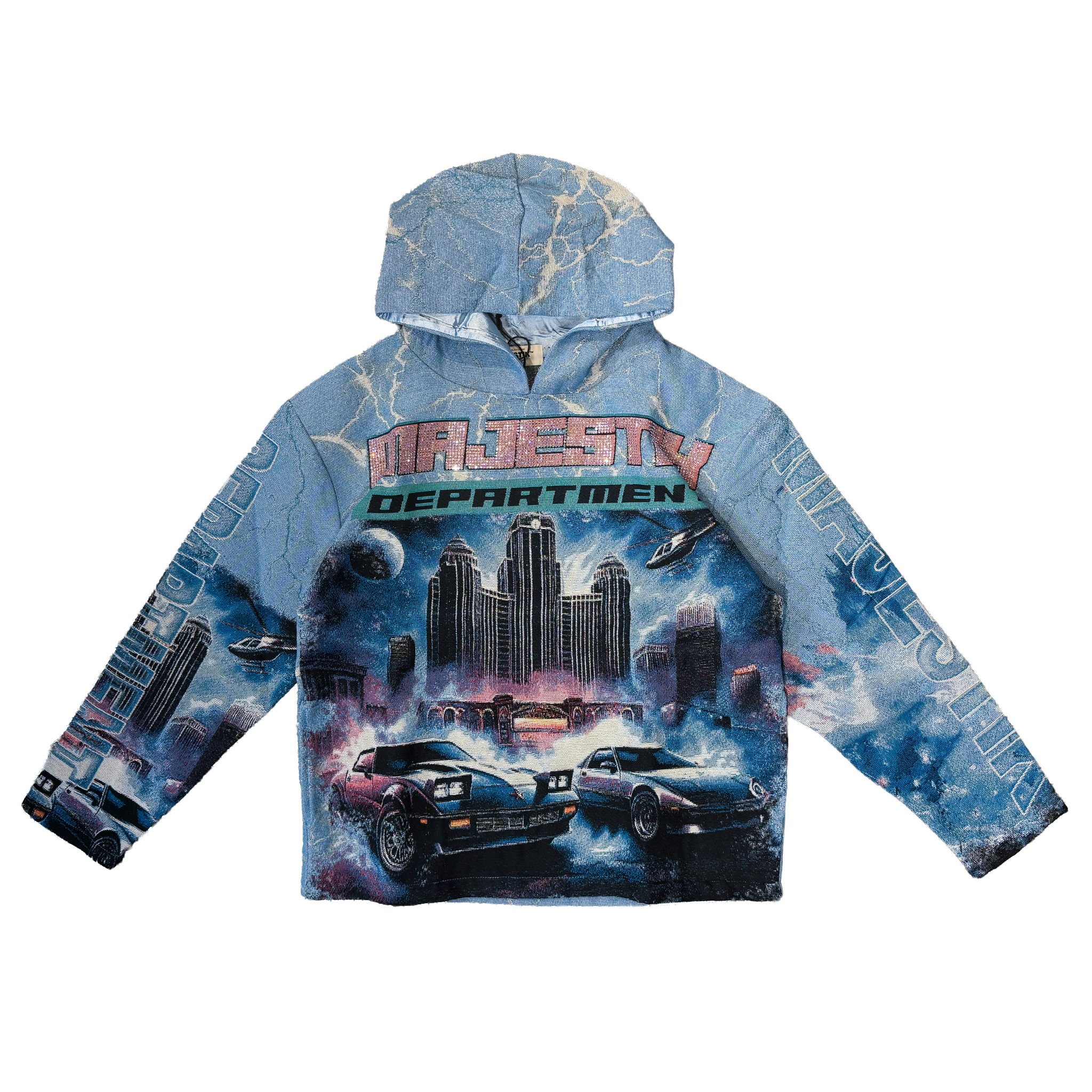 • This Majestik Skyline Tapestry Hoodie delivers a bold futuristic vibe with its full-tapestry construction and high-detail cityscape artwork. The front features muscle cars racing through a neon-lit skyline with planets and UFOs overhead, while the sleeves carry matching graphics for a fully immersive look. The back showcases lightning-charged text reading “Majestik Floatin’ Like a Problem,” adding attitude and movement to the design. Finished with an all-over woven texture and vivid colors, this statement piece stands out from every angle and can be purchased now at Future Rfrnce.
