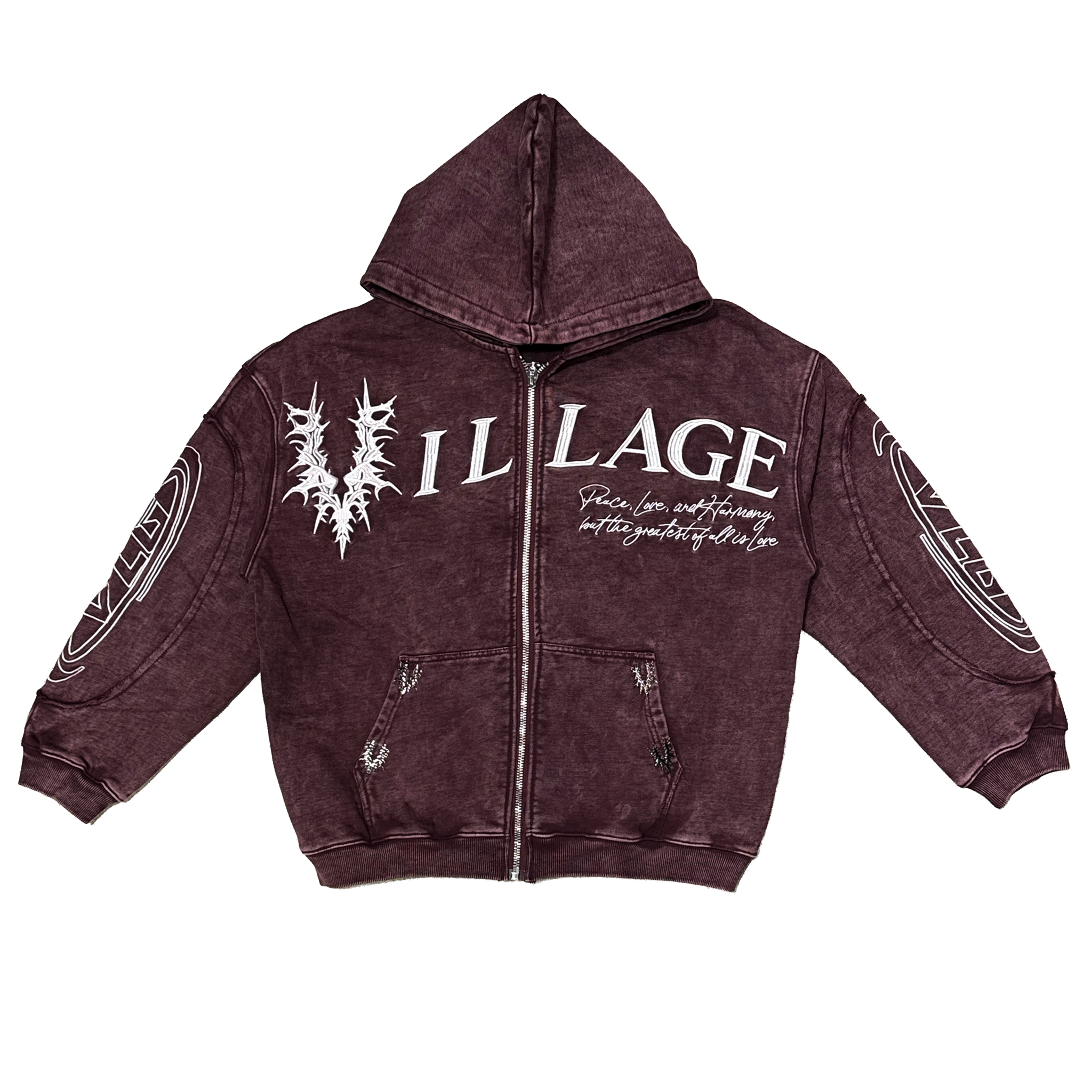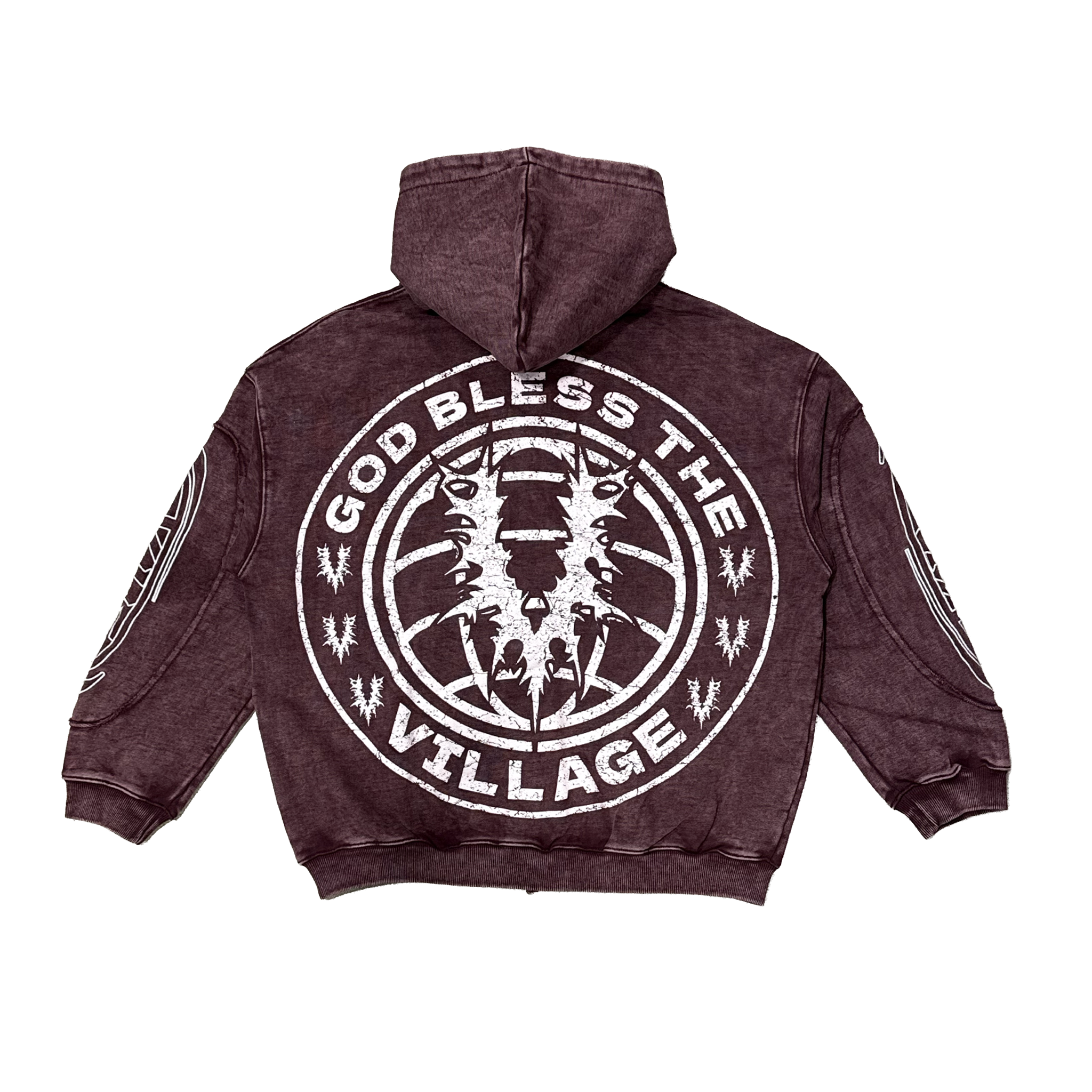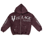- The Village Chrome Zip-Up in washed burgundy features a rich vintage finish paired with bold Village branding for a premium streetwear look. The front showcases sharp thorn-style graphics and script detailing, while the sleeves add layered chrome-inspired accents that elevate the design. A full-zip closure, adjustable hood, and front pockets provide everyday functionality with a statement edge. The back is finished with a large circular “God Bless The Village” graphic that ties the piece together with strong visual impact. Available now at Future Rfrnce.