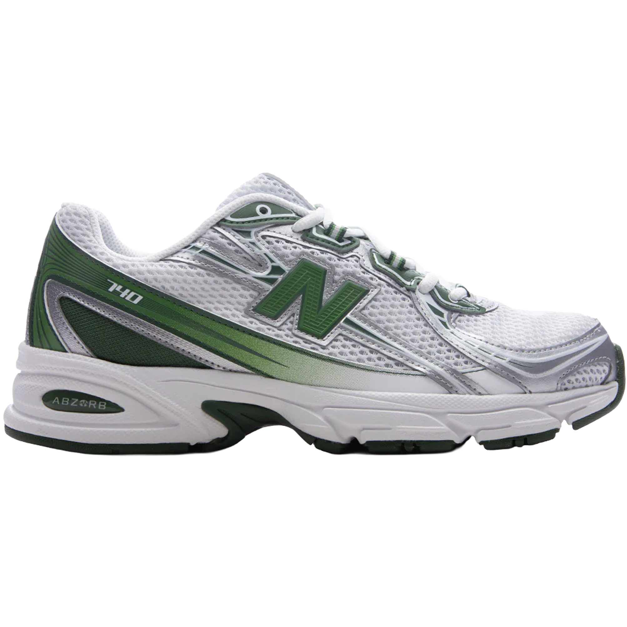 • The New Balance 740v2 “White Green” blends retro runner aesthetics with modern comfort. Featuring a breathable white mesh upper with metallic silver overlays and rich green accents, this sneaker delivers a clean, sporty look. The ABZORB midsole cushioning ensures all-day support, while the durable rubber outsole provides traction and stability. Perfect for casual wear or athleisure styling, this colorway gives a fresh twist to classic NB performance design. Available now at Future Rfrnce.