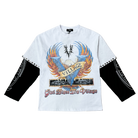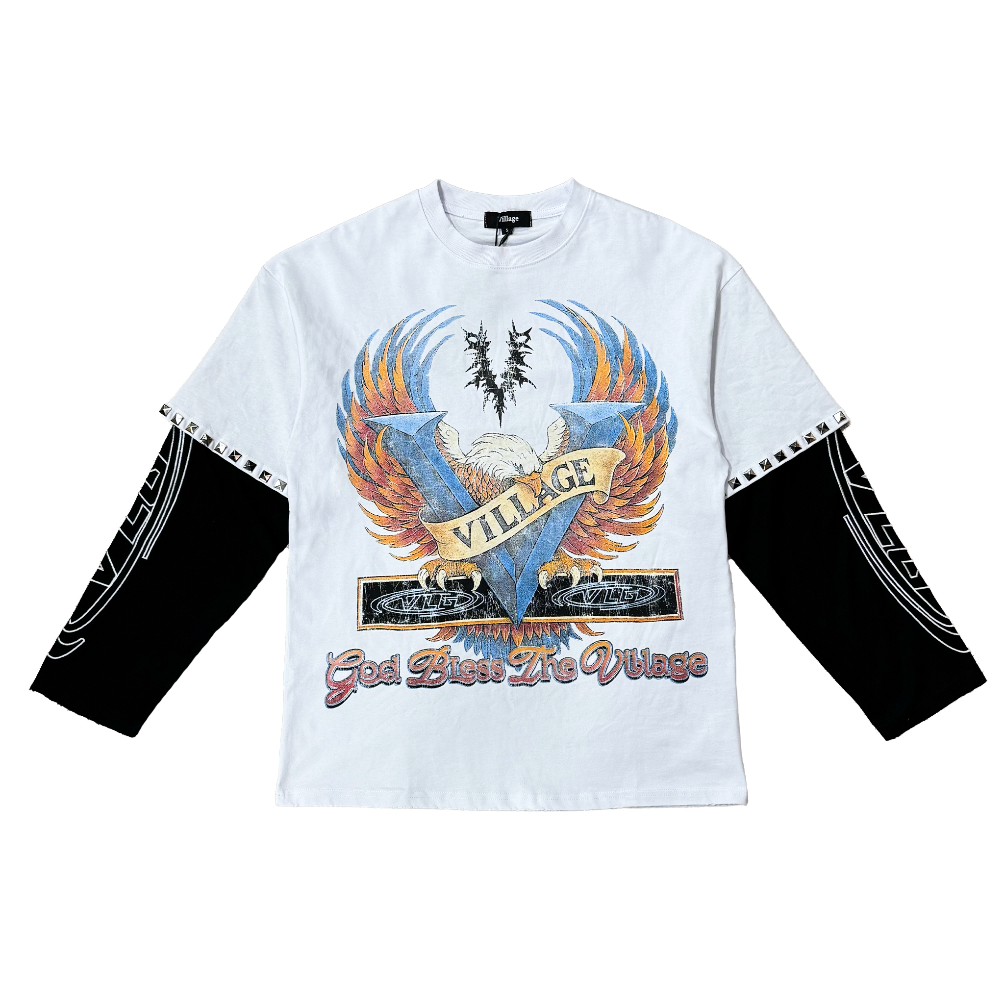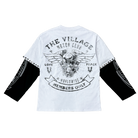 - This Village Motor Club long sleeve blends biker-inspired artwork with bold vintage graphics, creating a standout statement piece for any streetwear rotation. The front features a powerful eagle and banner design, while the back showcases a detailed motor-club emblem with “Members Only” and “Worldwide” messaging. Layered black sleeves with stud detailing add dimension and edge, giving the shirt a customized, elevated look. Its washed white base enhances the distressed printing for an authentic, lived-in feel. You can purchase this Village Motor Club long sleeve now at Future Rfrnce.