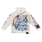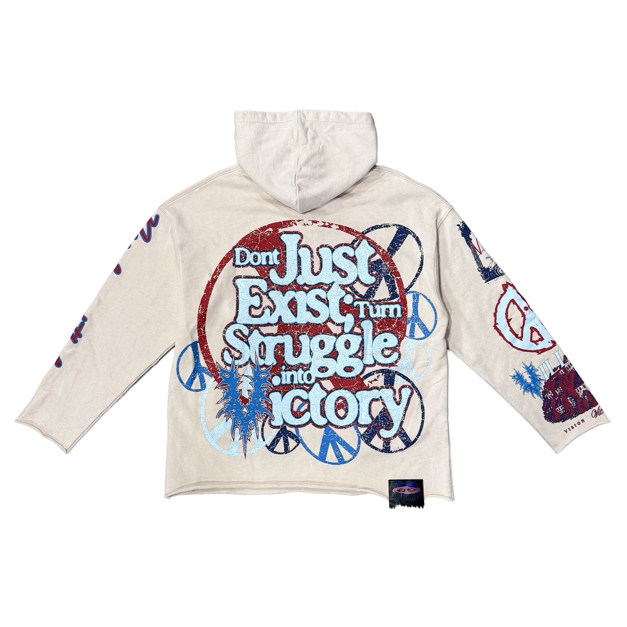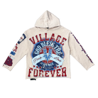 - This Village Forever cream hoodie features bold red and blue graphics that highlight themes of peace, love, and resilience, creating a powerful statement piece. Both the front and back are covered in distressed, vintage-style artwork that gives the hoodie a unique, hand-crafted aesthetic. The lightweight, washed cream fabric adds a soft, worn-in feel while allowing the vibrant prints to stand out. Detailed sleeve graphics complete the look, making this hoodie a standout addition to any streetwear lineup. You can purchase this Village Forever hoodie now at Future Rfrnce.