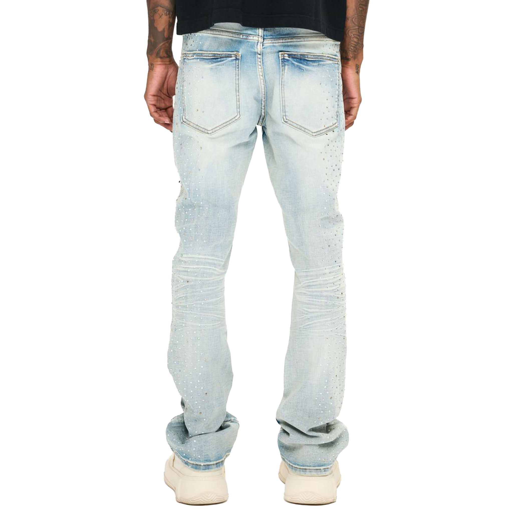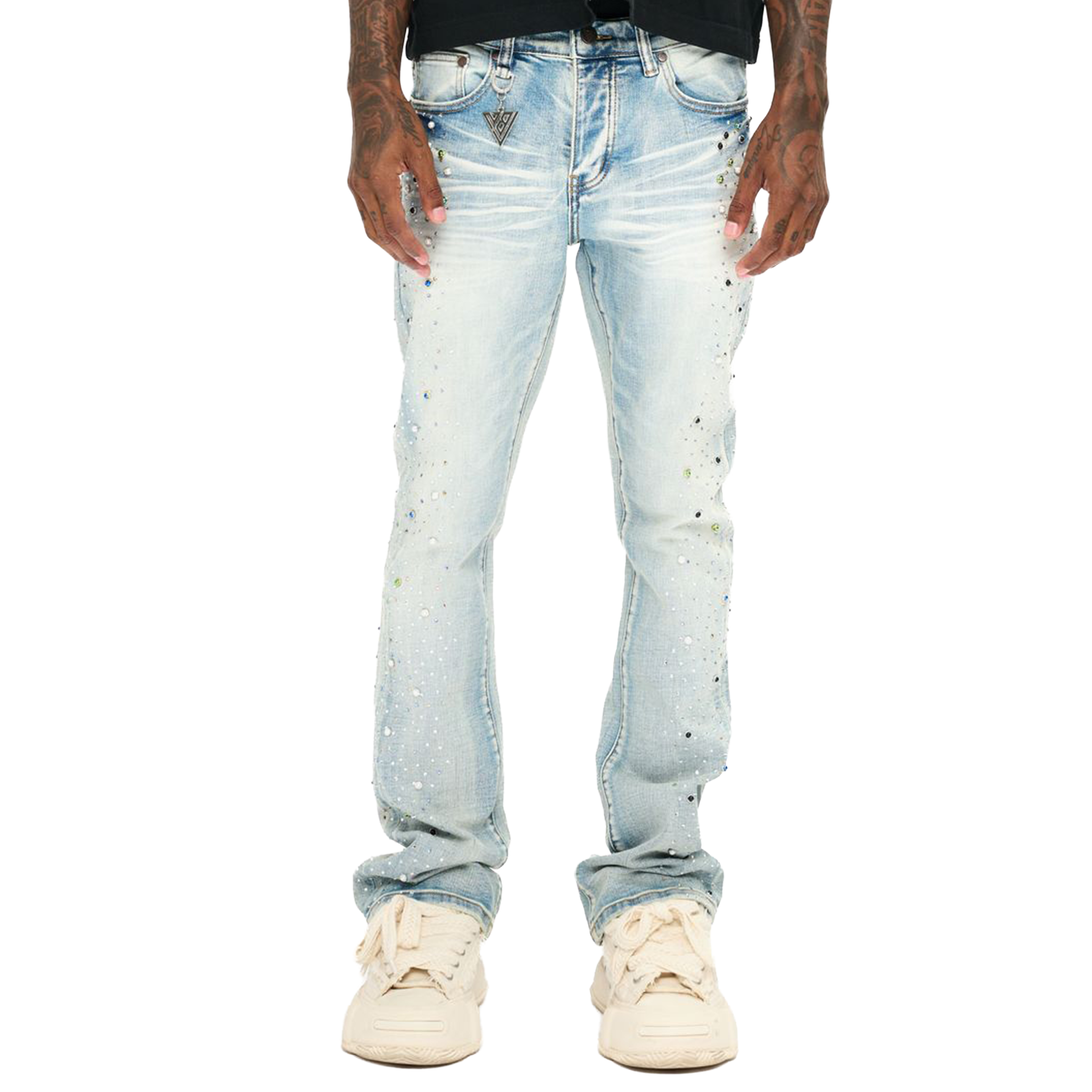 - The Valabasas Shine Stacked Jeans elevate a classic light-wash look with standout crystal embellishments that catch the light from every angle. Designed with signature stacked legs, they deliver a sleek elongated silhouette that pairs effortlessly with streetwear fits. Subtle distressing and the signature V-logo patch add an authentic Valabasas touch. Crafted for comfort with a premium stretch denim blend, these jeans balance durability with all-day mobility. Shop the Valabasas Shine Stacked Jeans now, available at Future Rfrnce.