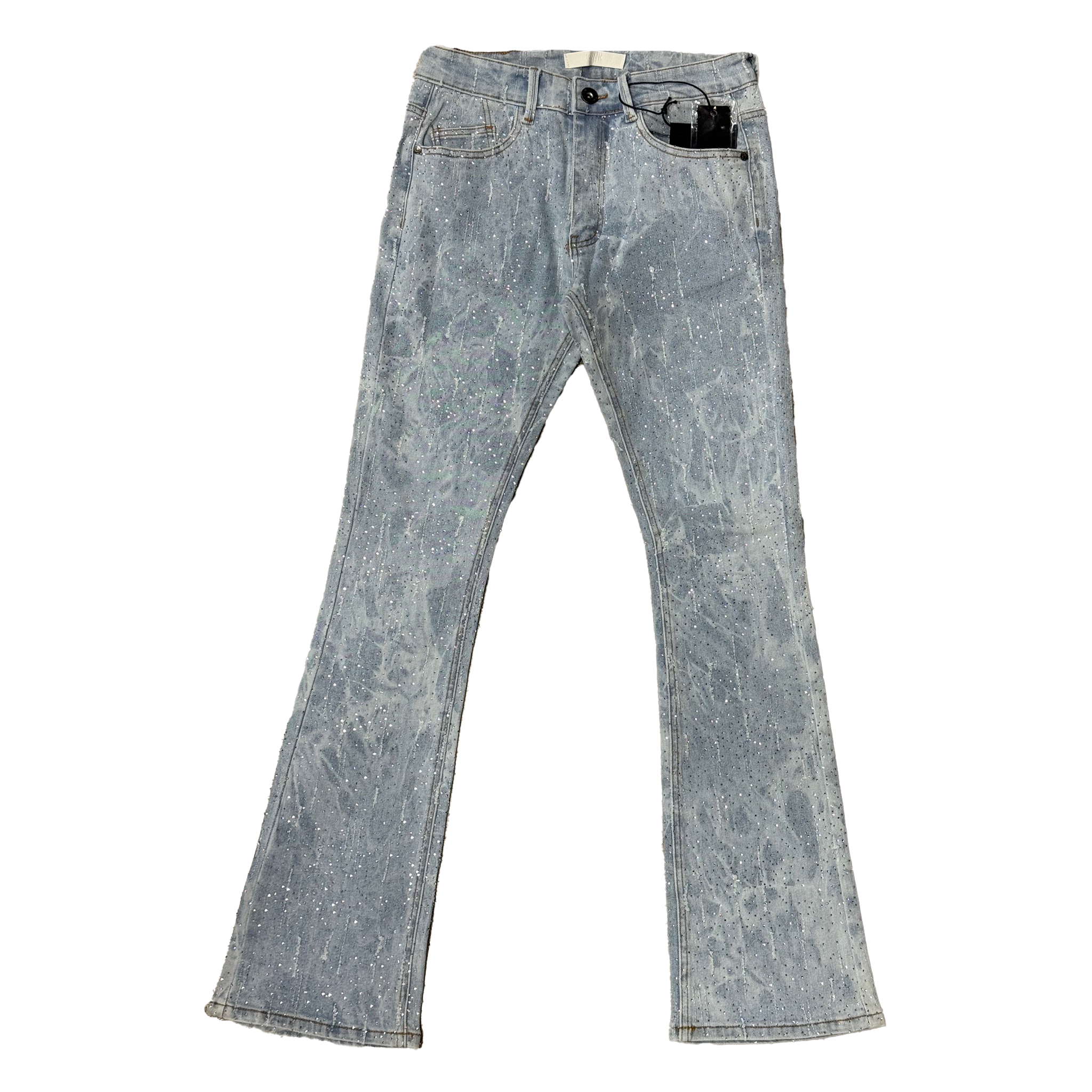 • The KDNK blue Rhinestone Skinny Flare Jeans combine sleek tailoring with standout design. Featuring a light blue washed denim base covered in shimmering rhinestone detailing, these jeans bring modern luxury to streetwear. The flared leg and skinny upper silhouette create a clean stacked look, perfect for styling with sneakers or boots. Crafted from premium stretch denim for comfort and mobility. Available now at Future Rfrnce.