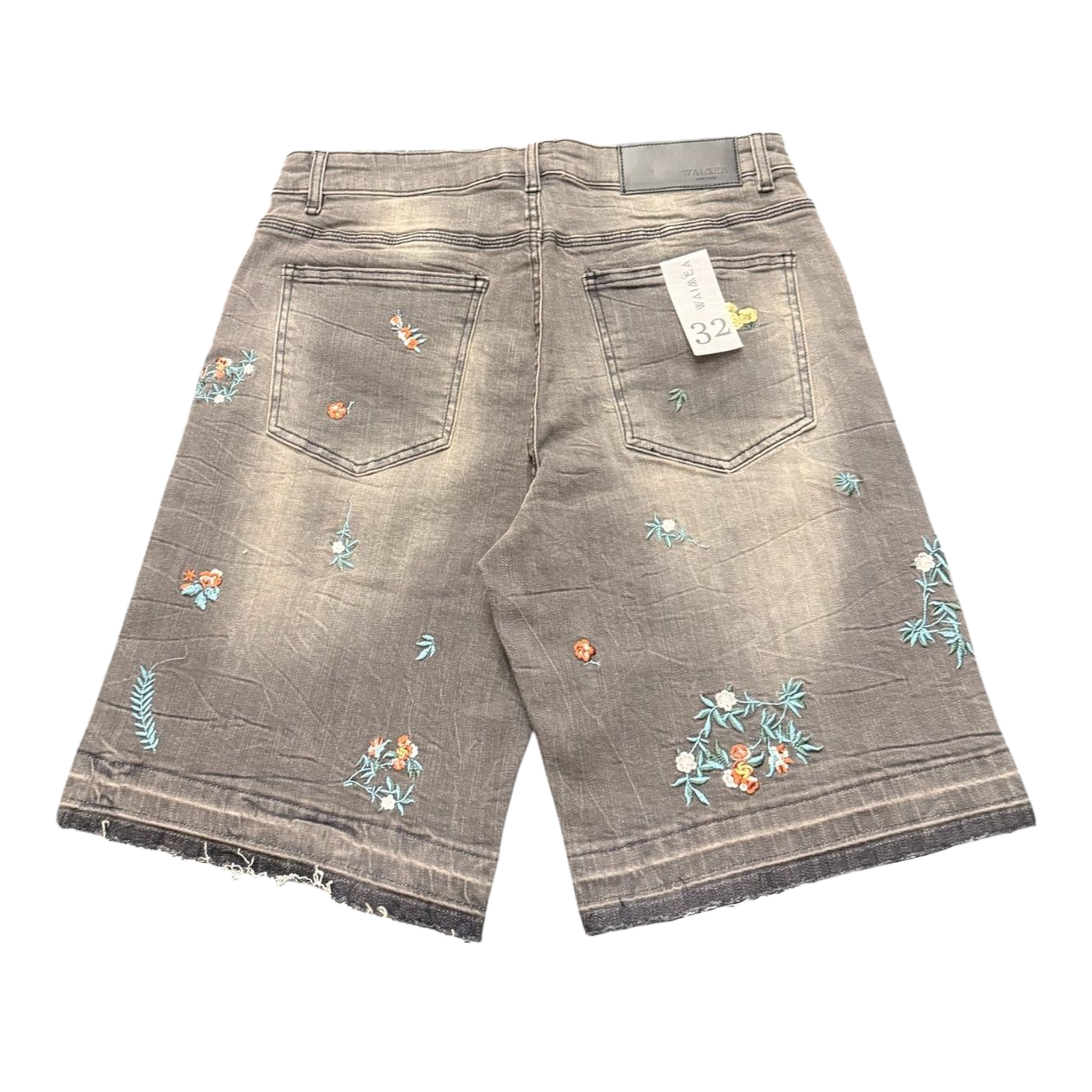 - The Waimea Floral Embroidered Denim Shorts blend vintage-wash denim with intricate embroidered detailing. These grey wash shorts feature colorful floral embroidery scattered across the front and back, creating a layered garden inspired design. The front also includes embroidered cherub figures that add a unique artistic touch, while the faded wash and raw frayed hem give the shorts a worn in streetwear feel. Built with classic five-pocket construction and durable denim, these shorts balance standout embroidery with everyday wearability. Available now at Future Rfrnce.